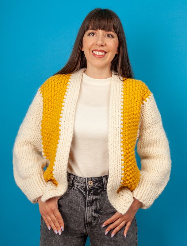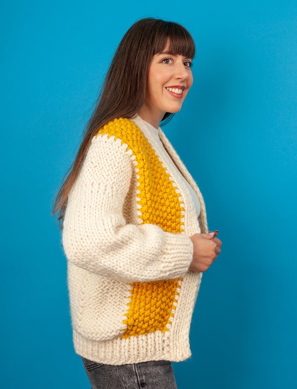 This hand knitted merino wool ladies cardigan is on of our more elaborate pieces, featuring geometrical color blocking and structured in such a way that it is as seamless and comfortable as possible. It can easily be worn as a jacket, and paired with a wide range of outfits.