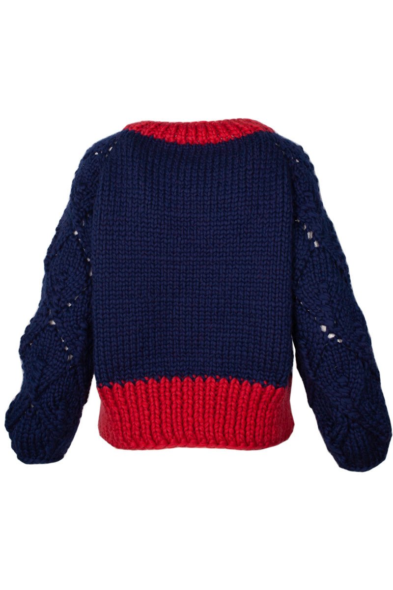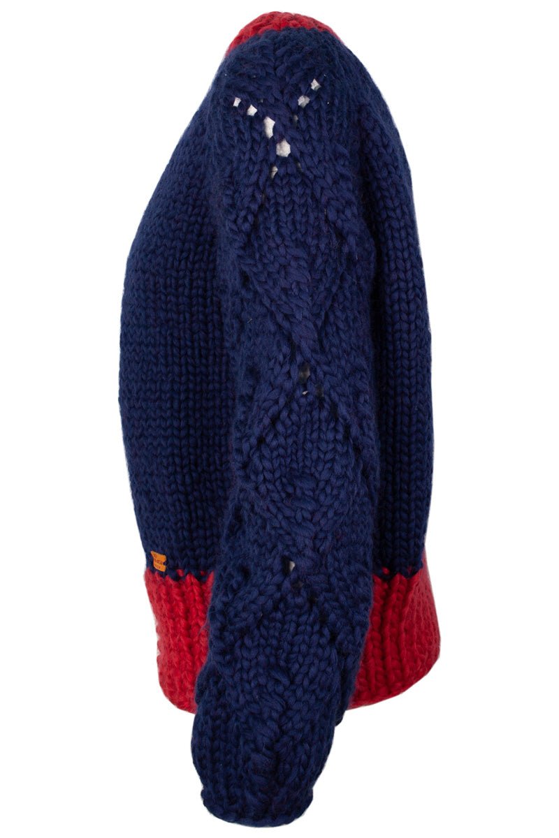 Ingrid is a two-coloured merino wool handknitted cardigan with a relaxed fit. It is structured enough to be easy to wear on days when you need your outfit to be functional and cozy, but due to the splash of whimsy the lace detail adds, it also satisfies ones need for a touch of fashion.