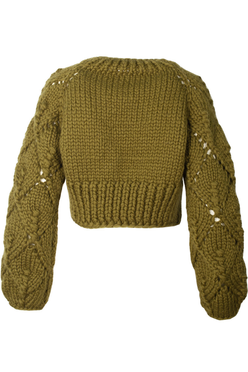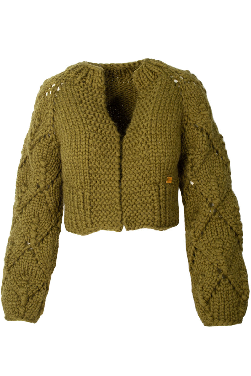 Spring is our handknitted merino wool (almost) cropped jacket. It plays well with high waisted jeans or your favorite skirt, it would even compliment an elegant dress on a formal night out. Its charm and versatility are due to its body hugging fit and chunky lace detailed sleeves, which add a modern and youthful twist to the garment without taking away from the ease and comfort of wearing it.